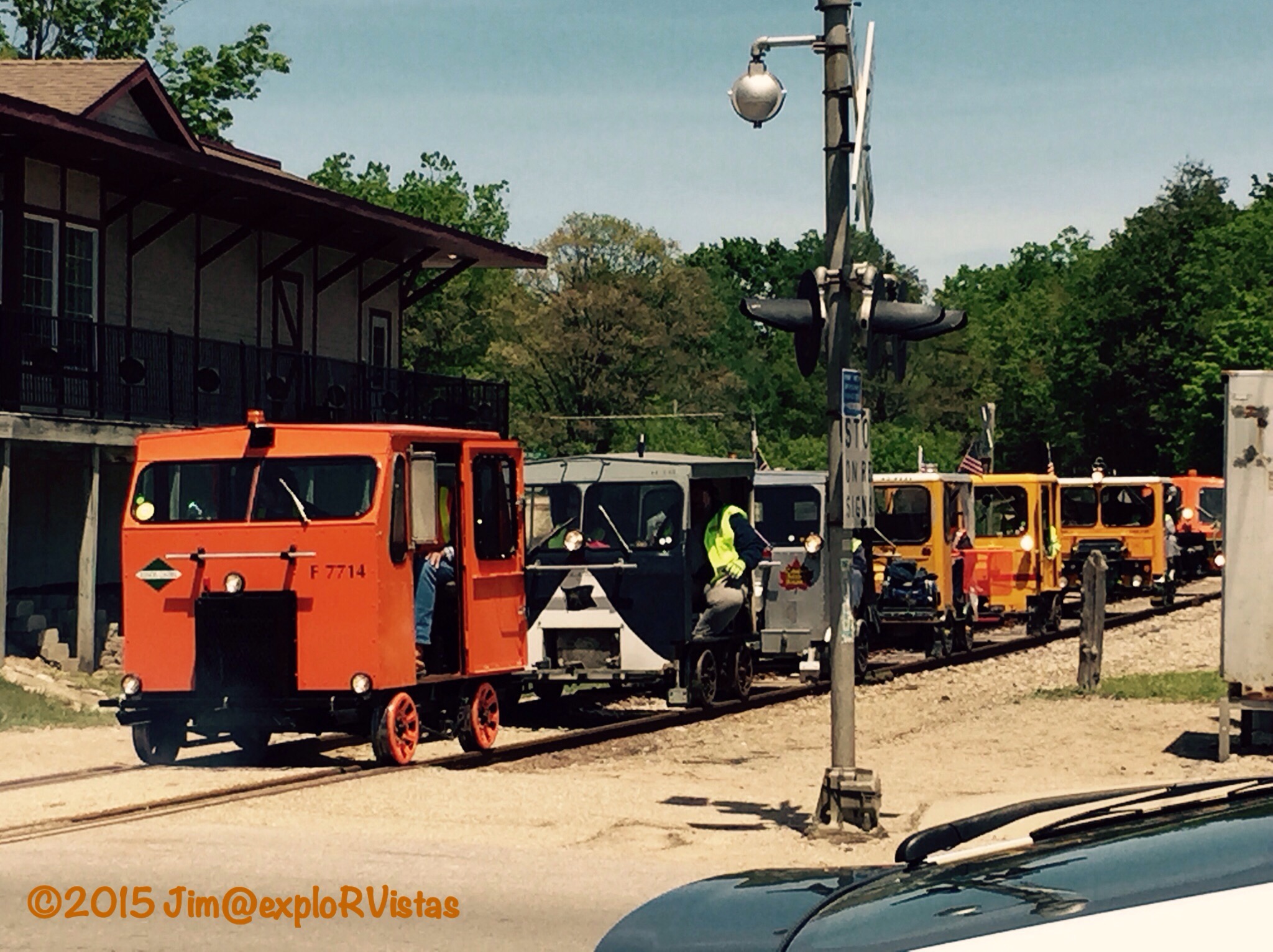 We saw these little restored railroad service cars coming down the tracks. After a little investigation, we found out that they are part of an organization called the North American Railcar Operators Association. They are all privately owned, and they take tours on local railroads. This particular event had 40 cars and went on a round trip from Traverse City, through Petoskey and Cadillac. It cost each car a little over $500, and that included two night’s lodging. We’ve never seen anything like it. Their air horns were particularly amusing!