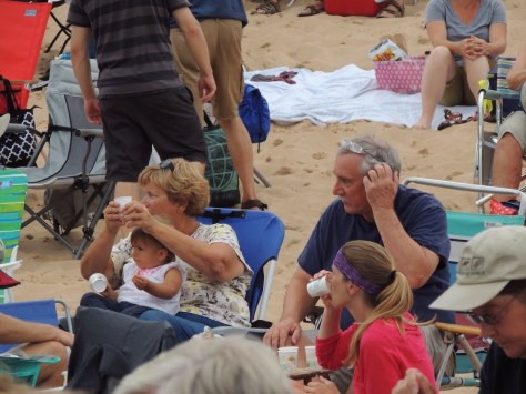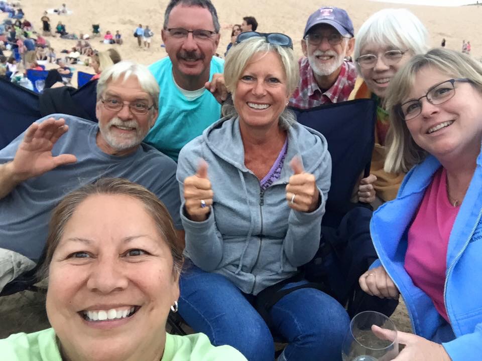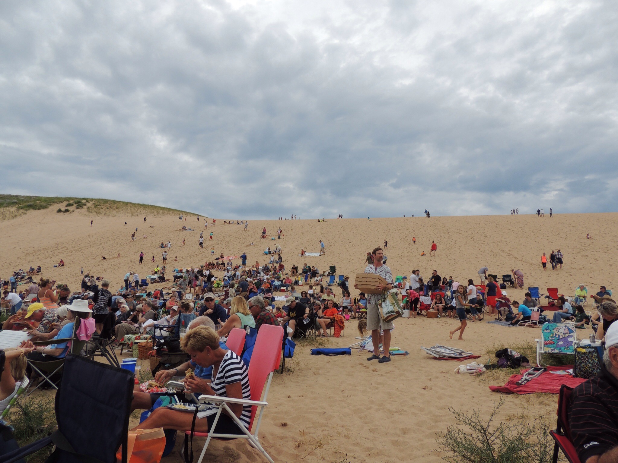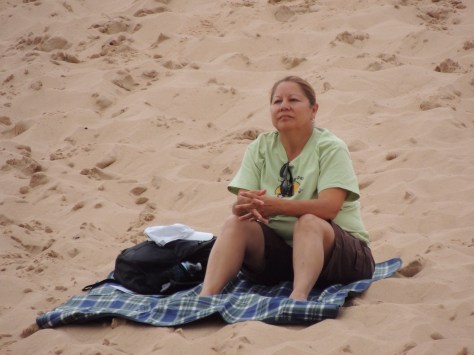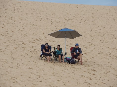 I spotted her high up on the dune…without any wine.  Diana dispatched me with a Solo cup of Pinot Grigio.  Remember, I said children like climbing the dune..hoo-boy, tough climb!  I did an end-around, came up behind her and said “it sucks when you forget your wine.” After a hug, she headed down the hill with me and joined us!