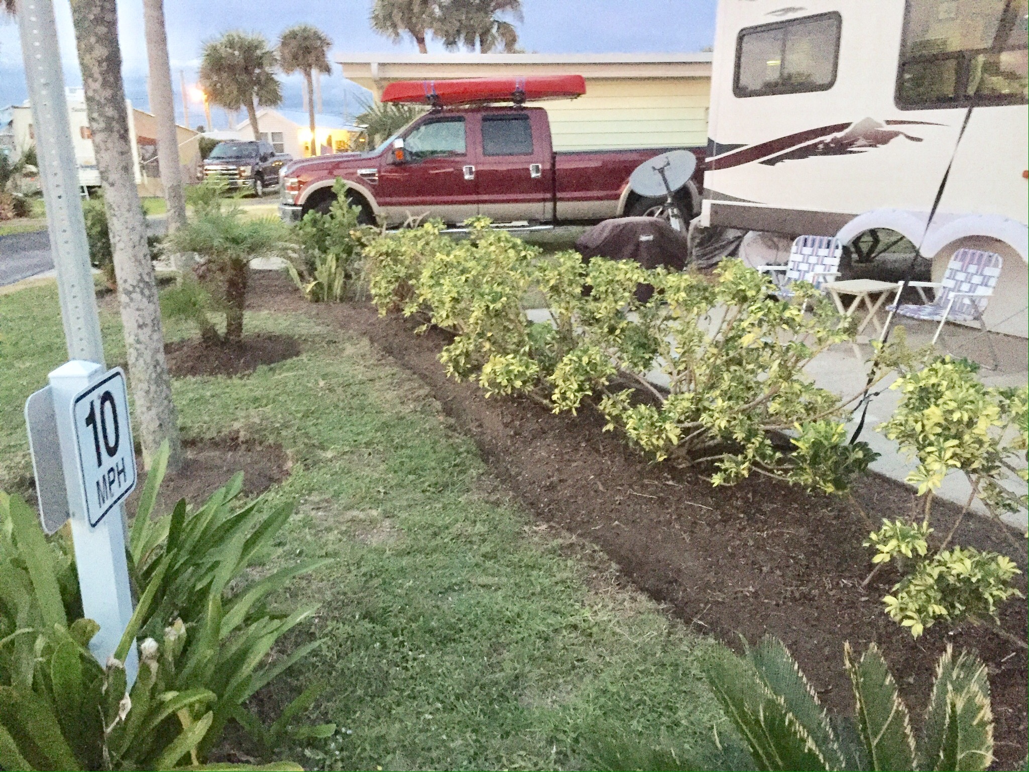 The new site is on a corner and is about 30 yards closer to the beach than the old one. There is a spot behind the RV for the truck, and a separate spot next to the rig for the Escape. The landscaping was put in place by the previous tenants…not by the park…so it is our responsibility to maintain it. It definitely needed a bit of sprucing up, since the weeds had been growing all summer.