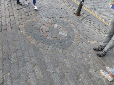 While enjoying the Royal Mile in Edinburgh, we made it a point to find the Heart of Midlothian Mosaic. This is the site of the former jail where the MacGregor chief was quartered then hung, and 30 warriors were hung in the spring of 1604. This was all done as the public gathered to view the spectacle. Scots spit on it. As we were approaching a tour guide was explaining the tradition to his group. I spit on it with gusto and he commented, “And there you have it.” I felt it was the least I could do to express my disgust at the treatment my ancestors received.
