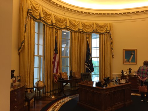Down the center of the atruim were these eight panels that discussed the timeline of each year of his presidency. While we were viewing the displays on the back side of these panels, a small entourage walked through. A woman was giving a tour to a well-dressed gentleman, and a few others were tagging along. Then I noticed a man in a suit next to me, nonchalantly looking at a display. He was wearing an earpiece…as were several others around the room! Secret Service types everywhere. None of them were looking directly at us, but you bet we were being watched! Not sure who the gentleman being given the tour was, but he had to have some major level of importance to be given that sort of protection. Don’t make a false move, kids….