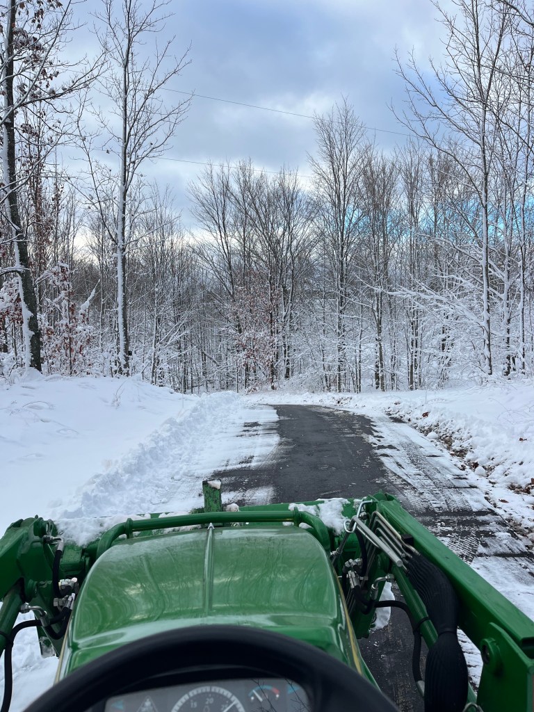 We did get a very snowy week in early December, which allowed me to get my tractor into snow removal mode! The combination of bucket on the front and blade on the back made quick work of the foot of the white stuff that fell. The bulk of our driveway is gravel, but the steep section by the road is asphalt. One portion of that is a 10% grade with a sweeping curve. When I was in high school, I plowed our church parking lot with the same set-up on a 1953 Ford tractor, but that lot was flat as a pancake. Our hill concerned me, so I took to the John Deere Facebook group I belong to for suggestions. There were two schools of thought to that hill. One said to use tire chains for traction. The others said that my turf tires were sufficient to run up and down it, warning that tire chains would damage the asphalt. Not wanting to mess up our pretty, new driveway surface, I chose the latter…even though I had already purchased the chains. It is here I should mention that I was running the back blade inverted…the concave portion facing rearward…so as to not scoop all the gravel off our drive. I continued that practice down the asphalt section, which left a hard-packed 1/2 inch of snow on it. That part of the driveway takes three passes to clear, with the bulk of it being finished it two. After my second pass down, I lifted the blade, turned around and headed up the hill. About 50 feet from the top, all 4 wheels started spinning and the front of the tractor drifted sideways. Being sideways on a tractor on an icy 10% grade is not an ideal place to be, so I went into problem-solving mode and dropped the bucket and back blade down. That acted as a brake and it also lowered my center of gravity. I came to a stop perpendicular to the driveway, 200 feet from the road…still on that steep grade. I gingerly got off the tractor and informed Diana of my predicament, then set out to try and use my truck to pull the tractor back up. I ended up not having enough tow strap and chains to reach it, so I scrapped that idea. I then got back on the tractor, refastened my seatbelt and lifted the front bucket ever so slightly. I then tried to drive forward, which swung the front end around and pointed it downhill. With the back blade acting as a brake, I slid all the way to the road. I then slogged through the deep snow on the side and joined the former school of thought and got the chains. Once installed, that did the trick. I backed up the drive without issue.