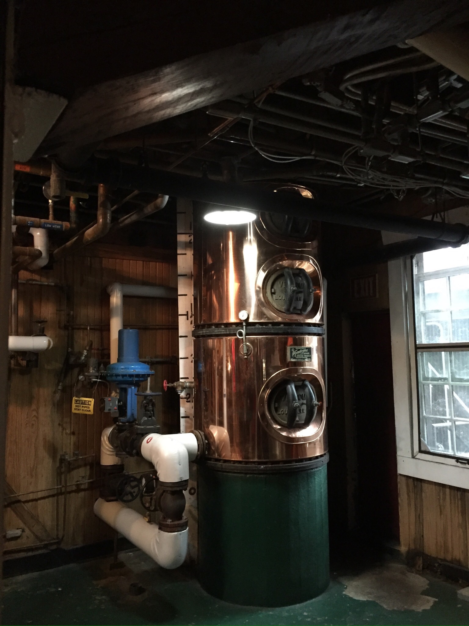 From the doubler, the alcohol runs into these spirit safes, which are large copper receivers. There is a hydrometer in the glass portion of each safe that measures the alcohol content of the spirits entering the receiver. The stillman’s job is to know when to seperate the undesirable heads and tails (the first and last portions of the run) from the pure spirits in between. He or she uses only the hydrometer and a thermometer to do so. The name spirit safe comes from Scotland, where the tax man held the only key to the padlock at the top…thus keeping the distillery workers from siphoning off pure spirits before the government had a chance to tax them.