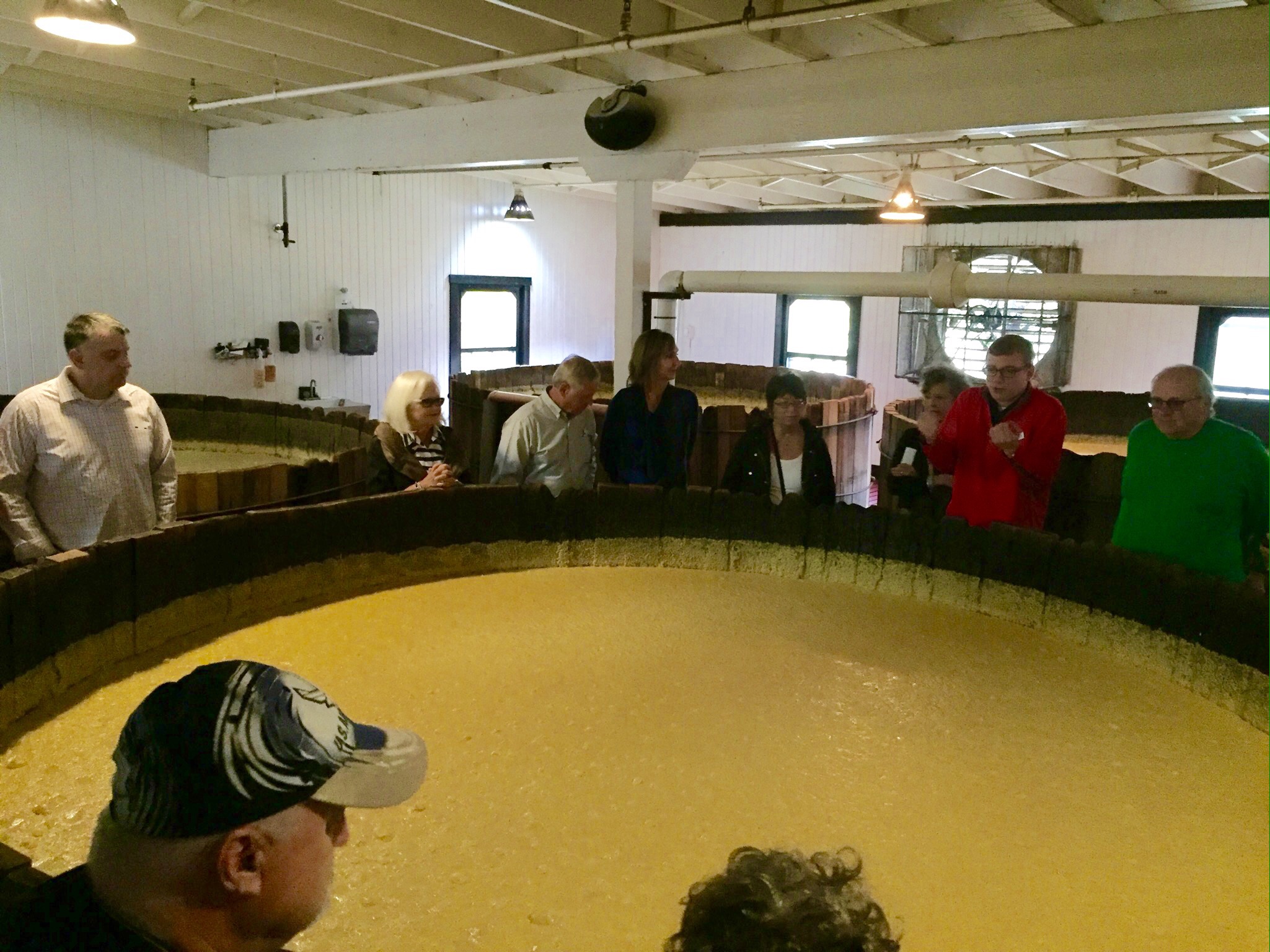 From there, it is mixed with spring water and put into large, century old cypress vats. Yeast is added to the mash, which generates carbon dioxide and heat, and the mash is allowed to ferment for three days. Maker’s Mark has its own strain of yeast that is 150 years old, and is a closely guarded secret. We were invited to dip our fingers in and taste the mash, which our tour guide said tasted like warm beer. I stopped just short of my mouth and asked him “is it gluten-free at this point?” He replied “No, it’s not.” I had to take his word on the beer comparison…but boy did that room smell good! The higher alcohol content further down the line would take care of the gluten…and any impurities from my tour-mate’s fingers. 😀
