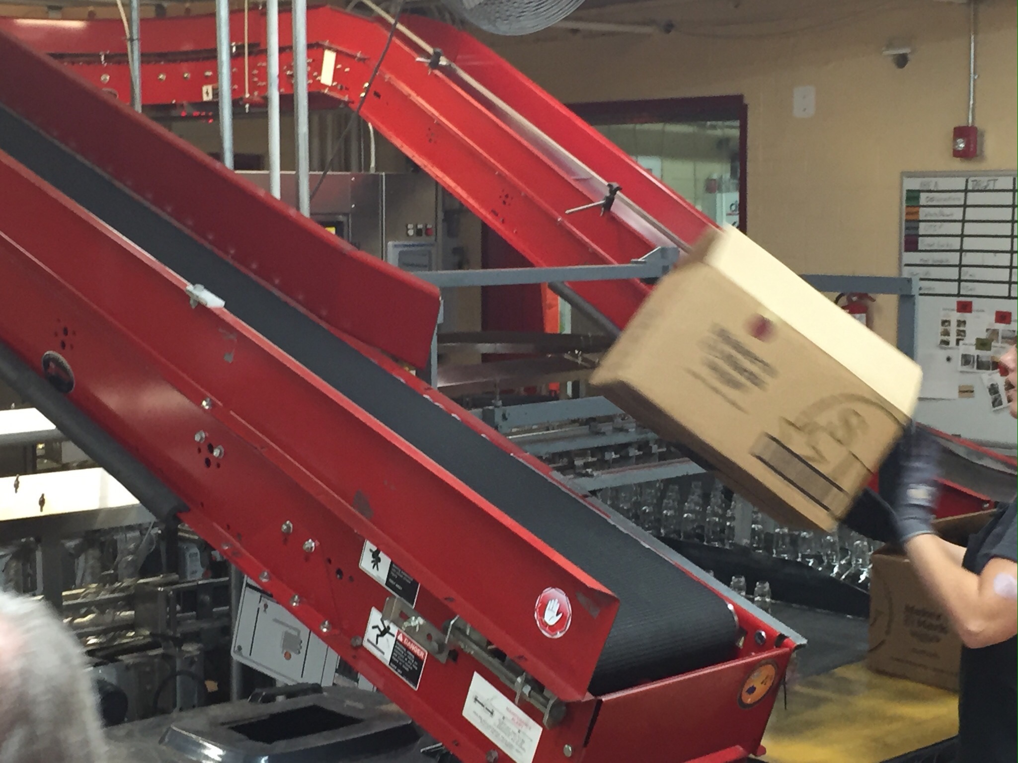 First step is to unload the bottles and put the boxes on a conveyer for use at the other end of the line.