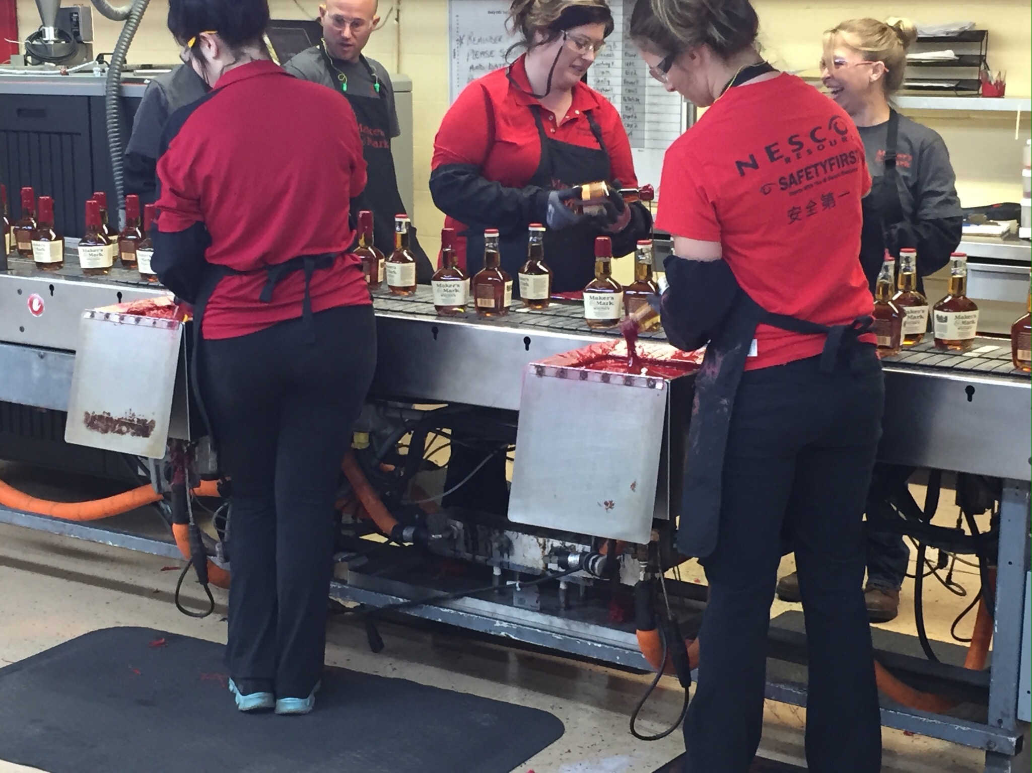 Four women, standing at four seperate stations, hand dip each bottle with the distinctive wax. If the wax drips onto the label, it is rejected. I had visions of Lucille Ball and her friend Ethel and their famous bit wrapping chocolates in a candy factory. 😃