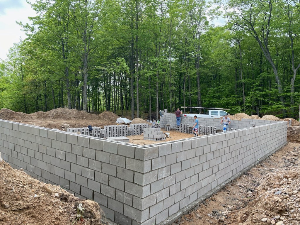While our cabin site itself had only a moderate grade to it, the surrounding land varies in elevation quite a bit. We determined the high corner at the time of excavation and let that decide how deep to dig. Our plan was to have a 6 course deep layer of concrete block make up our crawl space, which would bring us up 48” from the top of the footing. After the footing was poured, we decided we wanted a bit more comfort to ensure we had sufficient runoff. We had the mason figure in an additional course of 8” block, bringing us up to 56” above the footing.
