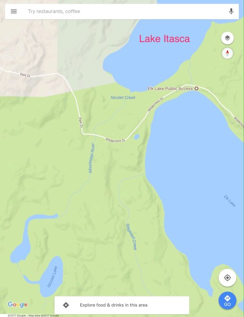 We waded across and didn’t even get our knees wet!  Definitely a fun place to visit…but something I saw on Google Maps had me wondering: is it the true source of the Mississippi?  After the river leaves Itasca, it flows into and out of several natural lakes.  That fact begs the question: are there any inlets flowing into Lake Itasca?  Well, as a matter of fact, there are two of them at the opposite end of the lake .  One comes in from Elk Lake, and the other comes in from Nicolet Lake.