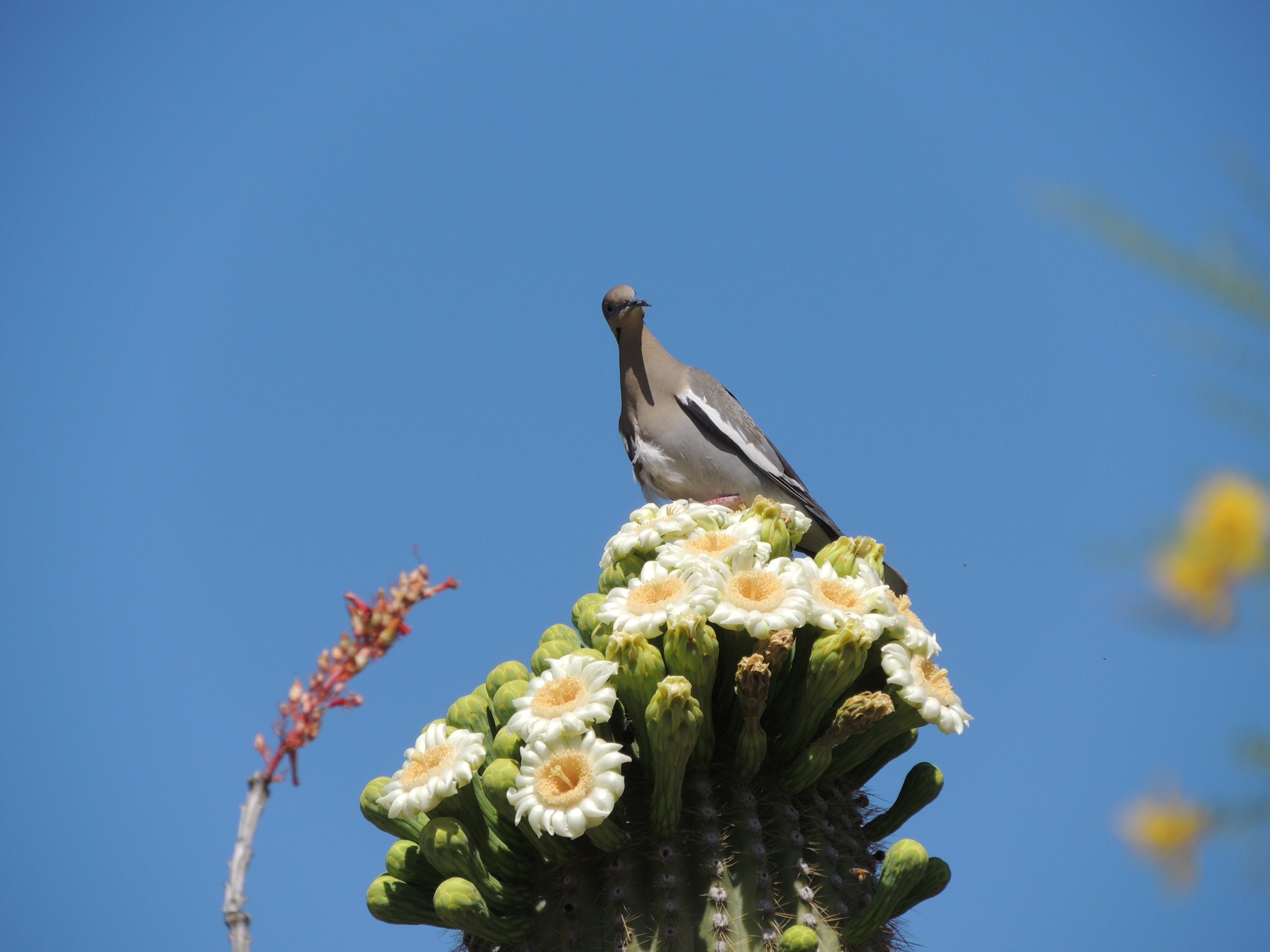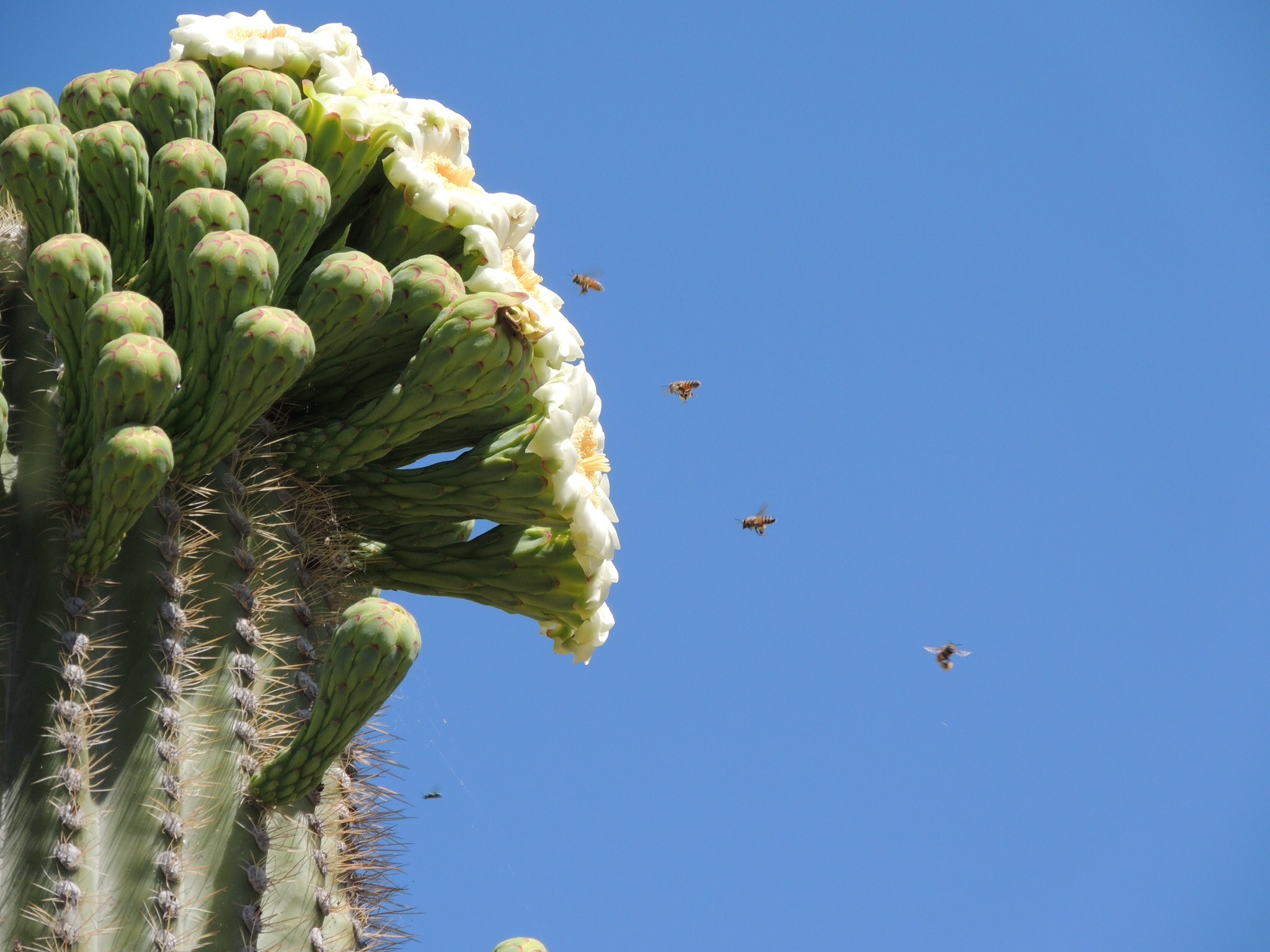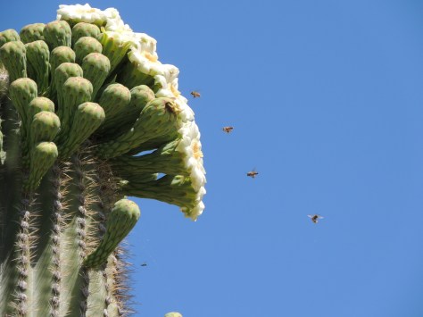 One thing we learned after getting to the Sonoran desert was that the Saguaro cactus normally bloom in May. Most winter RVers miss this, as they typically move north before the cactus show their flowers. As luck would have it for us, the blooms appeared early this year!