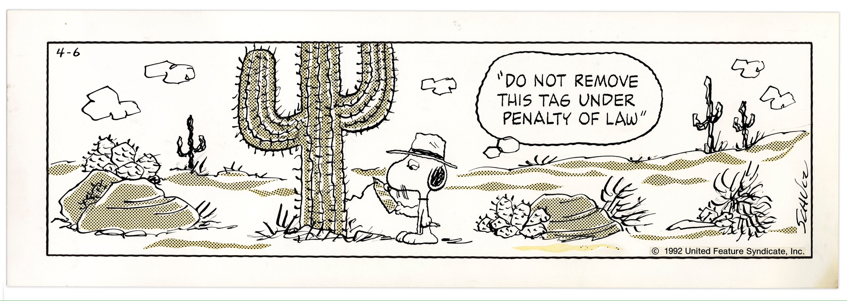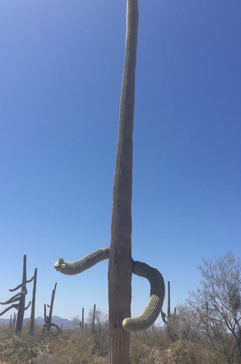 Diana and I have seen a huge chunk of this continent, but we had never seen a Saguaro cactus (pronounced sa-WAH-row) until this past week. As we drove into the Sonoran Desert on I-10 in Arizona, they began to appear along the roadside. Diana likened them to cartoon characters and my mind immediately went to the Peanuts comics, in which Snoopy’s brother Spike always seemed to be surrounded by them.
