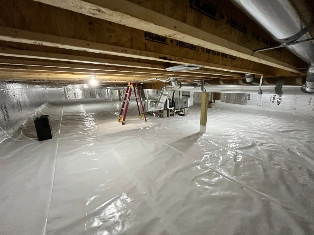 We had been running a dehumidifier constantly and the lowest we could get the humidity level was to 65%. Since total encapsulation is required by the building code, we figured we would be better off to get the 12-mil thick floor liner laid down before we left.