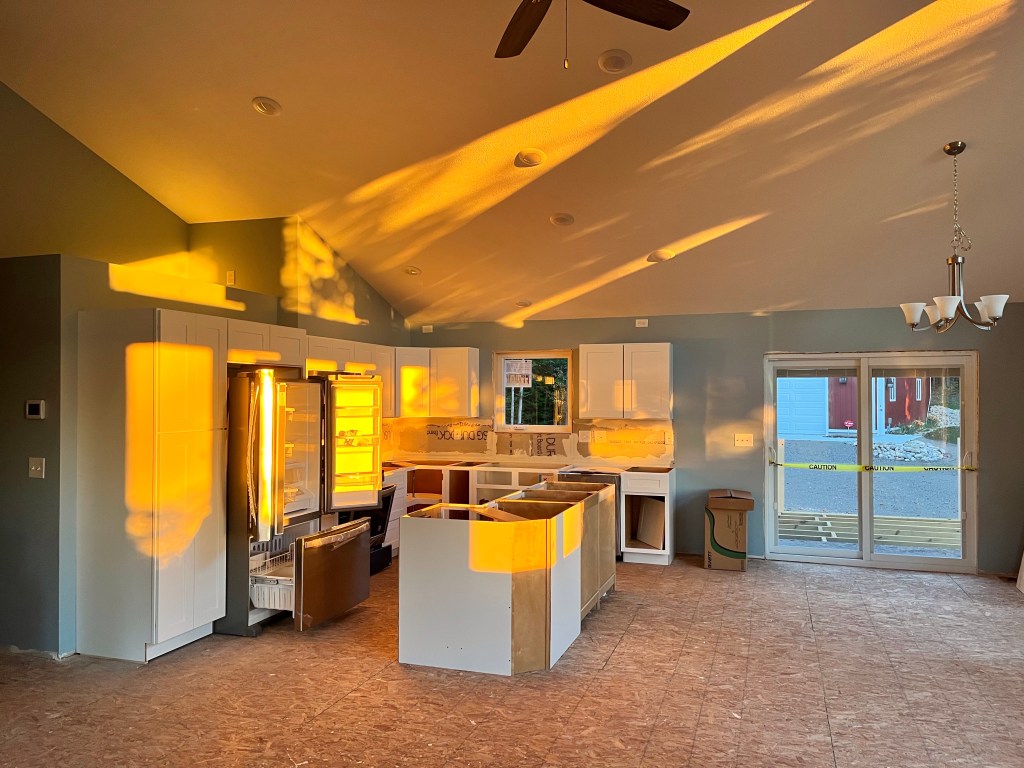 All of the upper cabinets are done, as is the pantry cabinet on the left. The base cabinets are assembled and in place; they just need doors, a rear wall on the island, and countertops. All of that gold you see in the photo is the morning sun streaming through the windows. There’s a lot of solar gain right there!
