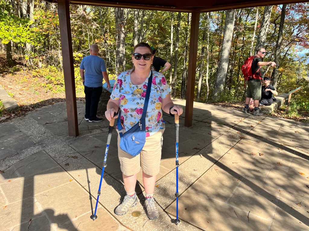 The sign at the saddle of the gap reads: Salt seeking buffalo, Moccasin clad warriors, Dreaming Pioneer, Battling Civil War soldiers. Each was here in the Historic Cumberland Gap and now so are you. This is the Historic Cumberland Gap. Across from the sign is an offshoot trail that heads up to Tri-State Peak. We followed that trail to a small gazebo that covers a US Geological Survey marker.