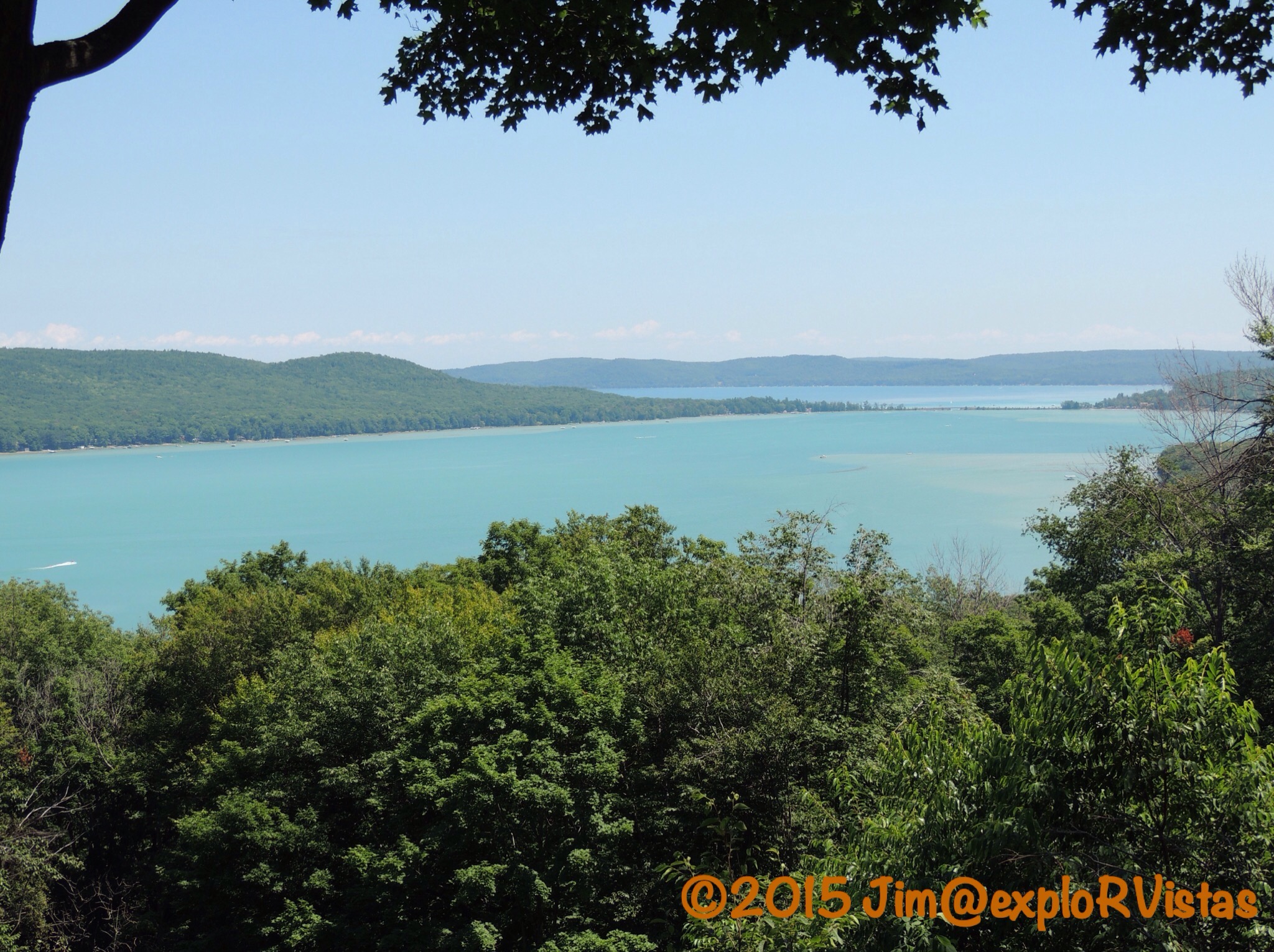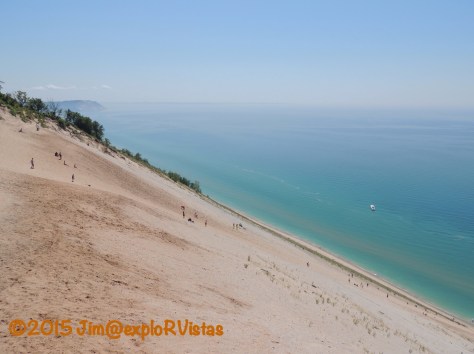 The lake is 450 feet below at this vantage point! For orientation purposes, this photo looks due west. Lake Michigan dominates the horizon. Note the size of the two boats rafted together, as we will revisit them at the end of the post.