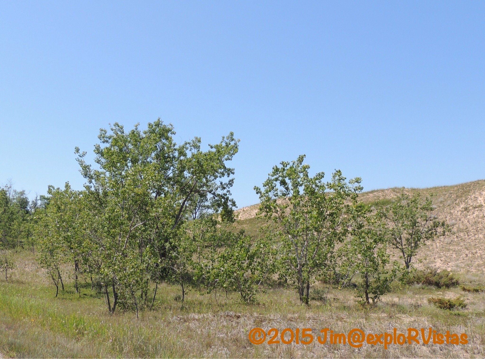 Cottonwood trees are common on the exposed dune. As a cottonwood is buried by the shifting sand, the roots sprout new growth. As a result, what appears to be several trees, is actually one tree.