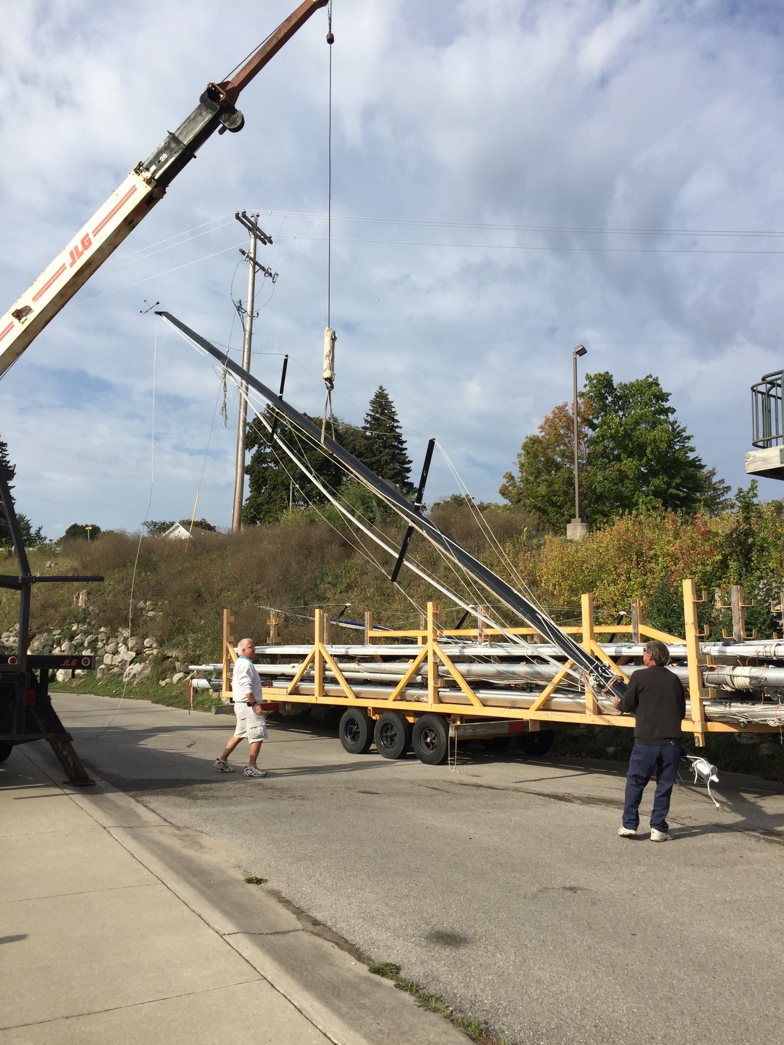 First thing they did was lift the mast from the boat, secure the rigging and then store it on a trailer with a multitude of other masts.
