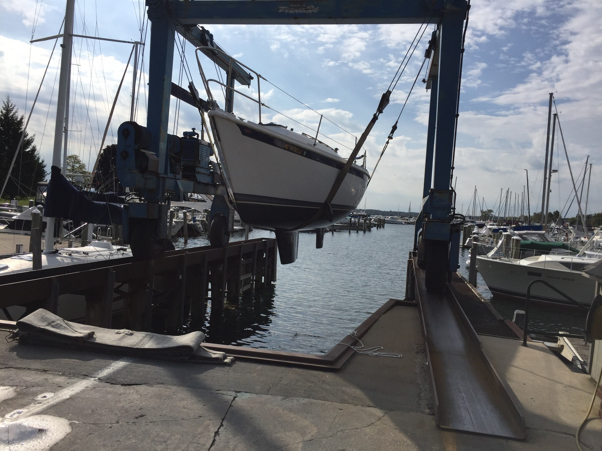 On Tuesday, Diana and Mary headed to Grand Rapids to do some shopping and to check out Meijer Gardens and some of the Artprize entries there. I rode along with Rod to Traverse City where he was having his boat stored for the winter. It was neat to see the process of pulling the vessel out of the water.
