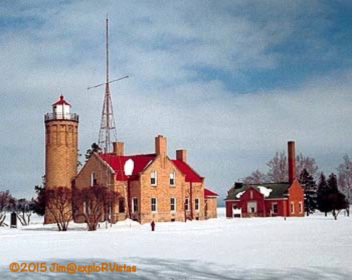 Here is a February photo of mine from one of my trips up there. Note the red and white lantern room, which was not historically correct. The radio tower was also not part of the original station, and was moved off the property in later years.