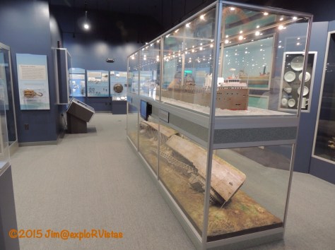 The interior of the building houses a beautiful shipwreck museum. There are several displays with models of the original ships as they appeared on the surface, and the corresponding model of how each shipwreck currently sits at the bottom of the Straits of Mackinac. This is the display of the 604 foot limestone carrier Cedarville, which was lost in heavy fog off Old Mackinac Point in 1965. It collided with a Norwegian freighter, killing ten crewmembers. It lies in two pieces in 110 feet of water. Kudos to MSHP on this addition to the light station, as it is very well done.